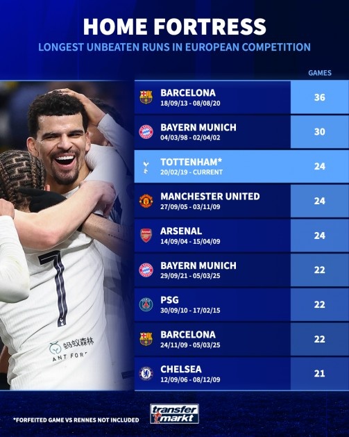1月21日讯 欧冠联赛阶段第7轮比赛,热刺在主场以2-0的比分战胜多特。尽管在联赛中表现不佳,但热刺在欧冠中却重拳出击。本场比赛之后,北伦敦球队欧战主场不败场次增加到24场。根据德国转会市场的统计,热刺欧战主场不败场次足以位居第3位。